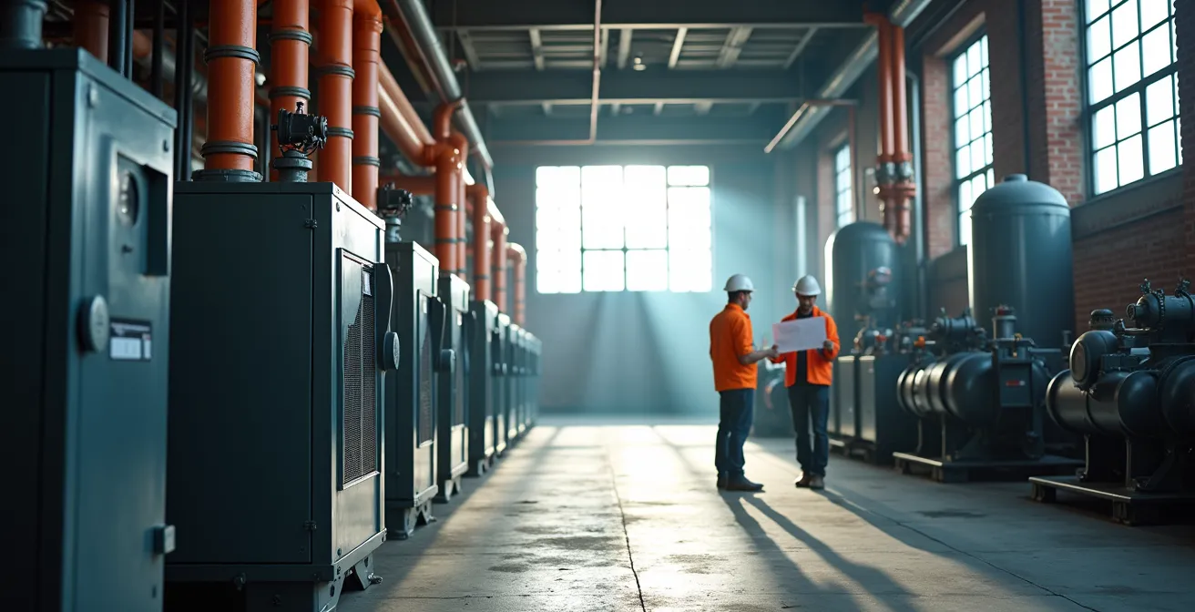 Le point de départ de toute stratégie d’électrification n’est pas la chaudière, mais les rejets thermiques de votre usine. Les systèmes d’air comprimé sont une source majeure de chaleur fatale de bas grade, souvent négligée. Jusqu’à 90% de l’énergie électrique consommée par un compresseur est convertie en chaleur. Plutôt que de la dissiper avec des aérorefroidisseurs, cette énergie peut être récupérée pour des besoins de chauffage à basse température, comme le préchauffage de l’eau de lavage, le chauffage des locaux ou l’alimentation d’un procédé en amont.